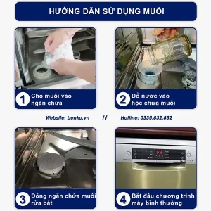 • Để đạt kết quả tối ưu, hãy kết hợp muối rửa bát với các chất tẩy rửa khác trong quá trình sử dụng máy rửa bát.