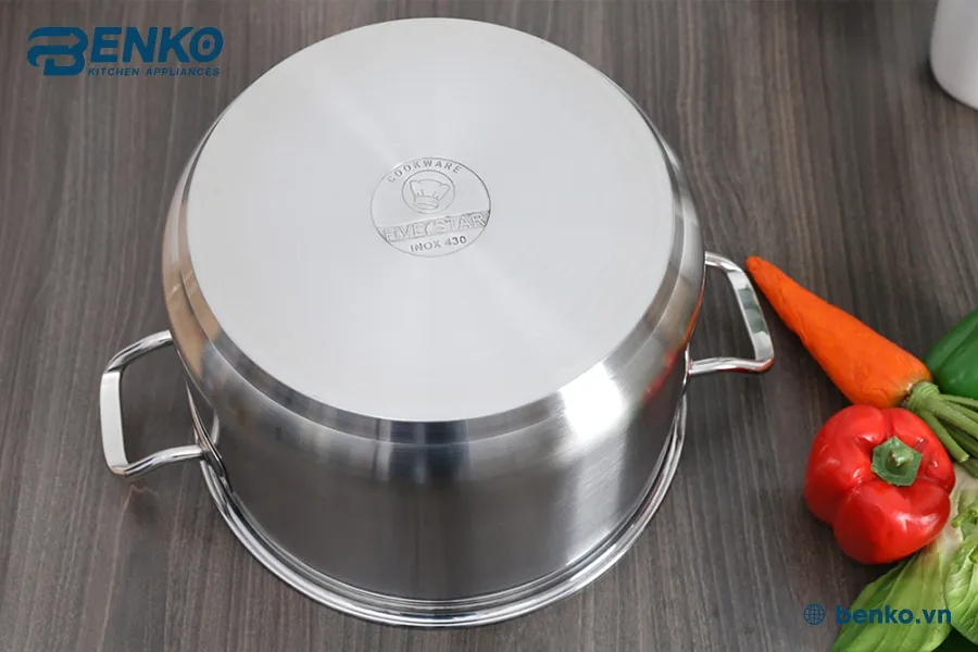 Đáy từ của nồi inox có 3 lớp (inox – nhôm – inox) lớp inox 430 ngoài cùng có tính nhiễm từ, lớp giữa là lớp nhôm giúp cho việc thu nhiệt nhanh và dẫn nhiệt tỏa đều, lớp trong cùng là inox 430.