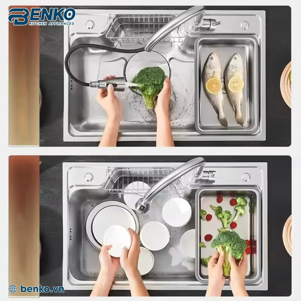 Điều này cho phép bạn tùy chỉnh chậu rửa theo nhu cầu sử dụng cụ thể của gia đình, nâng cao hiệu quả công việc bếp núc.