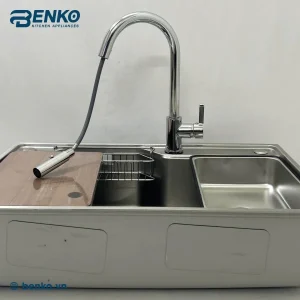 Kiểu dáng chậu rửa bát 1 hố lớn, kết hợp vòi rút pull out màu crom hiện đại, giúp cho sản phẩm này không chỉ tạo điểm nhấn sang trọng mà còn tối ưu hóa không gian sử dụng, bạn dễ dàng rửa các vật dụng cồng kềnh và sơ chế thực phẩm một cách thoải mái nhất.